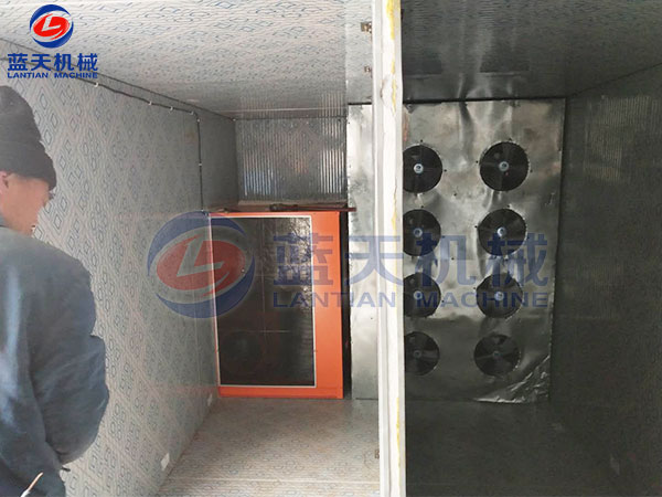 江蘇淮山烘干設(shè)備烘干現(xiàn)場,江蘇王總購買的是箱式淮山烘干設(shè)備,切片裝入托盤物料車進行烘干。