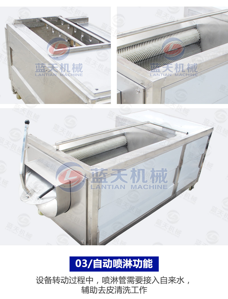 山藥搓光條機采用SUS304不銹鋼制做,設備上部有高壓噴淋對山藥表面進行沖洗可有效的洗去表面粘有的泥沙、中間有毛輥,通過毛輥的轉動帶動山藥的前進,并對山藥的表面進行刷洗可深層清洗山藥表面粘連的不易沖洗的雜物,毛輥采用雙層毛刷可以將表面的毛發和纖維物的清除。經山藥搓光條機去除纖維雜物后,提高了山藥的潔凈率。下部可進行水收集使之能循環利用,節約了成本。