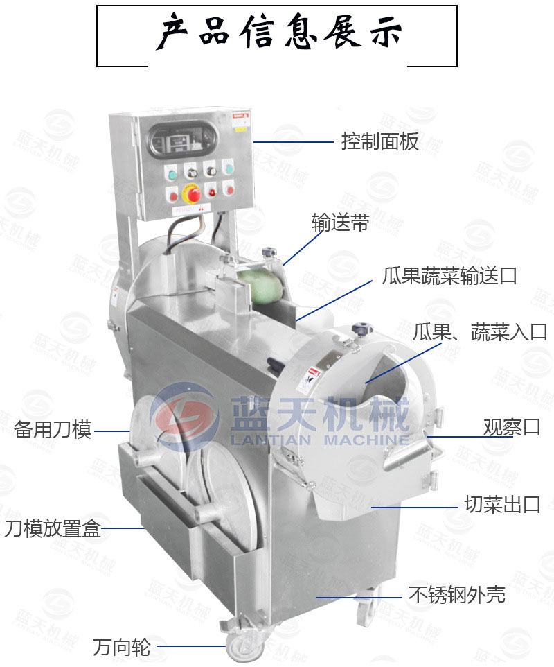設有安全按鈕,門打開使整臺設備無法轉動,速度快,產量大,通過雙變頻調節速度,大型山藥全自動切片機可切出1-60MM規格的段,操作簡單,易清洗。